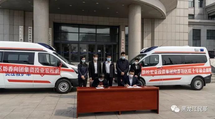 当日下午,捐赠仪式在香坊区人民政府门前举行,由新松宏业投资集团董事长孙杨与香坊区卫健局党委书记、局长籍婷现场交接了所捐赠的救护车钥匙,新松宏业投资集团黑龙江区域总经理黄深与香坊区红十字协会副会长赵淑萍签署了捐赠协议,完成了简易的捐赠仪式。